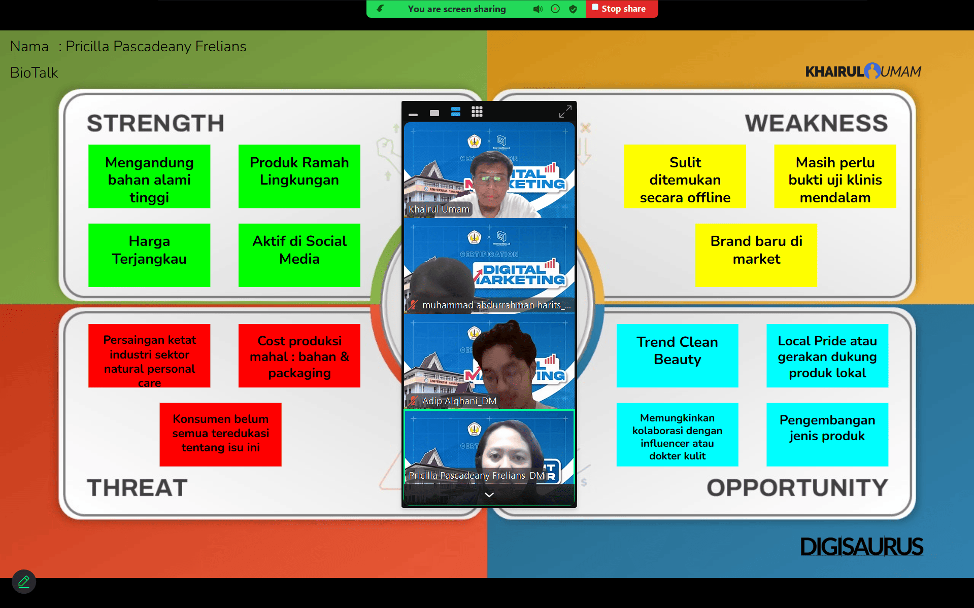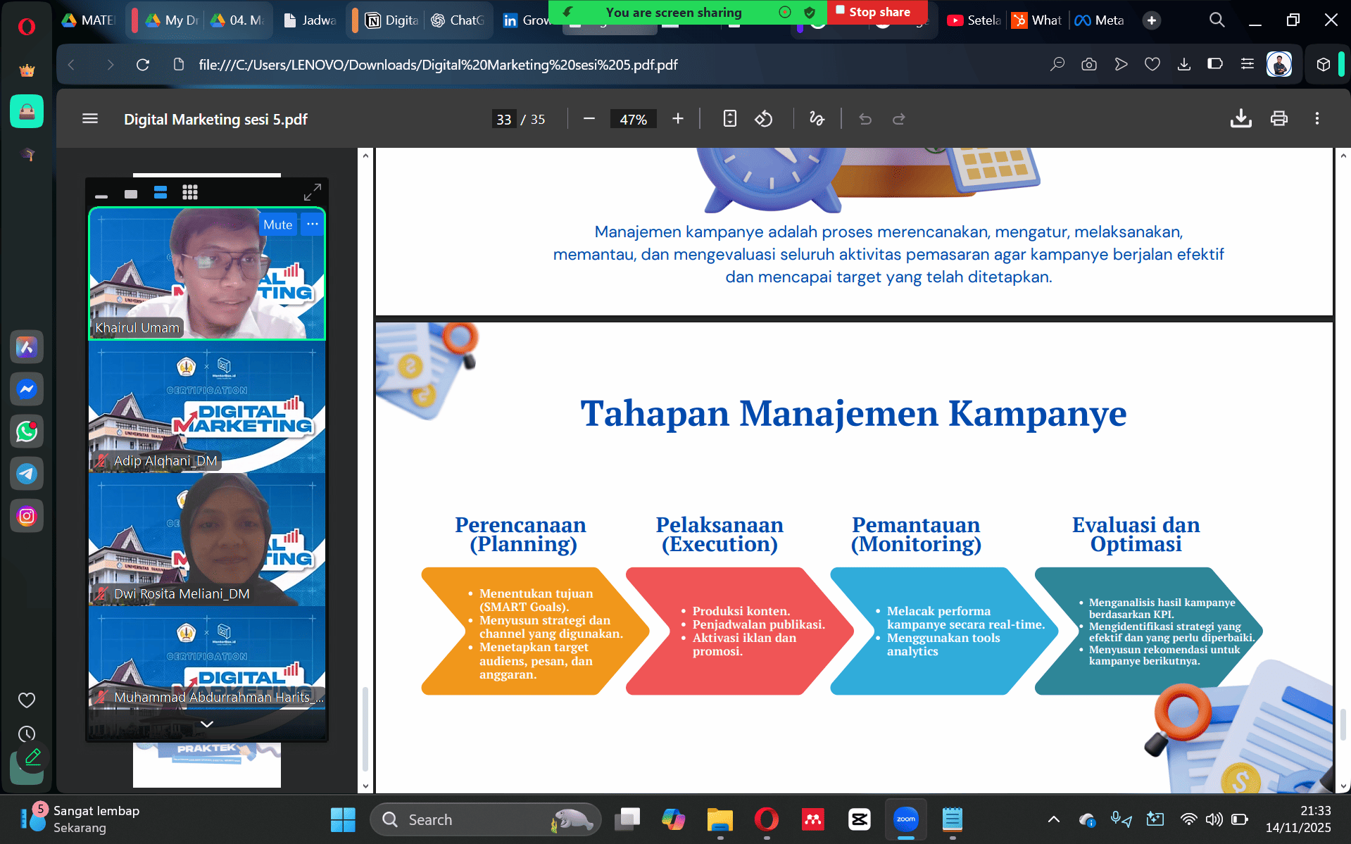 Selama pelatihan, peserta mempelajari materi komprehensif yang mencakup Product Knowledge & Business Model Canvas, Keyword Research, pengenalan media digital untuk pemasaran, perancangan strategi digital marketing, hingga manajemen end-to-end kampanye digital. Peserta juga dibimbing mendalami penyusunan Marketing Objectives, Marketing Funnel, strategi konten, budgeting, timeline campaign, dan pengelolaan kampanye pemasaran.